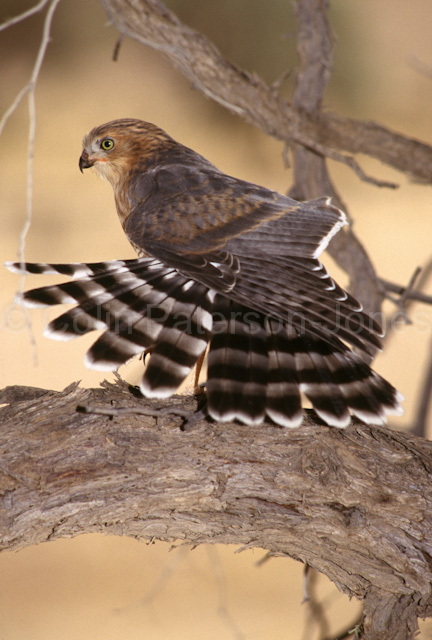A juvenile Gabar Goshawk, Melierax gabar, perched with tail spread in the Kgalagadi Transfrontier Park, Northern Cape, South Africa