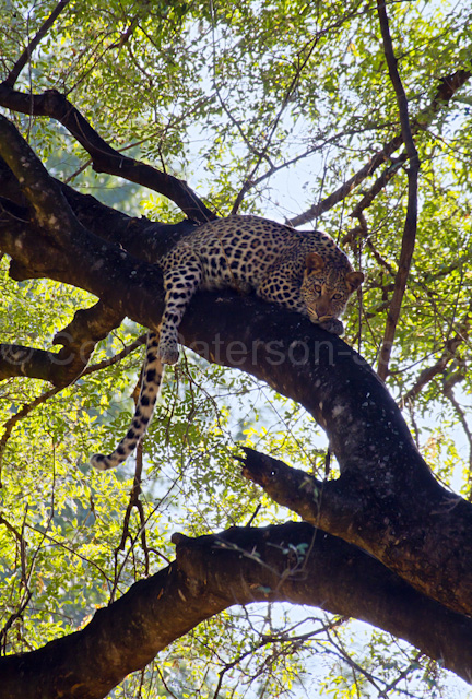 A leopard, Panthera pardus, lying on the branch of a large tree in the shade of the gallery forest along the Luvuvhu River near Pafuri in the northern Kruger National Park, Limpopo, South Africa