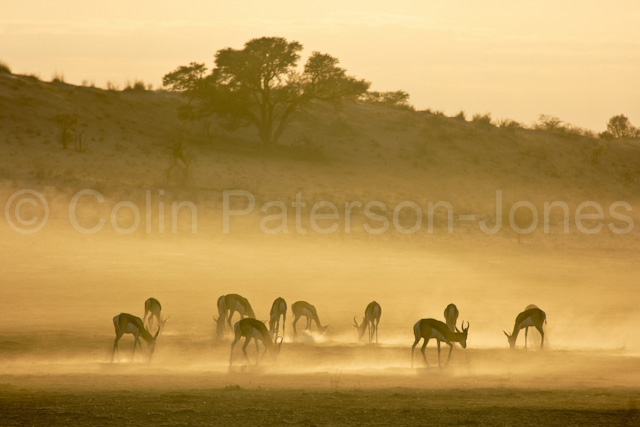 Springbok, Antidorcas marsupialis, at dawn kicking up dust, digging for roots and bulbs in the dry Auob Riverbed in the Kgalagadi Transfrontier Park, Northern Cape, South Africa |