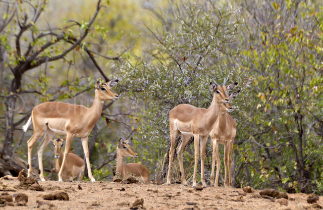 Alert Impala, Aepyceros melampos, does emerging from bush in the Kruger National Park, Limpopo, South Africa