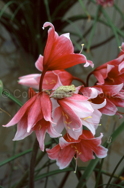 A Painted Reed Frog, Hyperolius marmoratus, perched on a Crinum campanulatum flower in summer in a seasonal pan near Peddie, Eastern Cape, South Africa