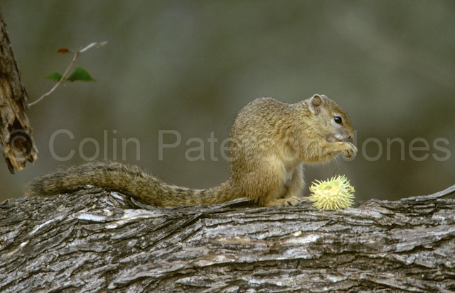 A Tree Squirrel, Paraxerus cepapi, eating the seeds of a Wild Cucumber, Cucumis anguria, Kruger National Park, Limpopo, South Africa