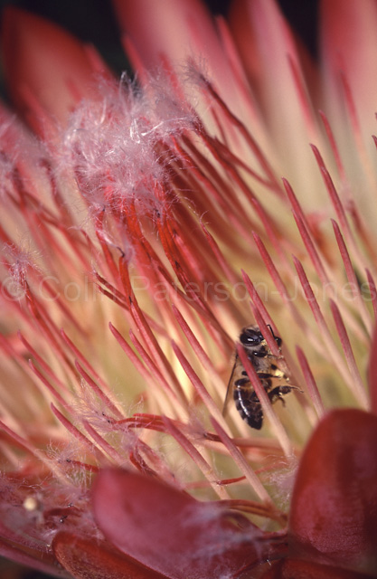 A Honey Bee, Apis mellifera, in a Suikerbossie, Protea repens, flowerhead in autumn at Kirstenbosch, Cape Peninsula, South Africa
