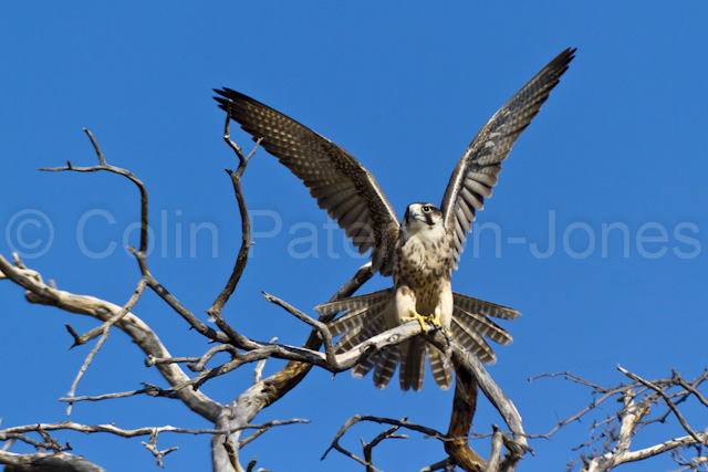 A juvenile Lanner Falcon, Falco biarmicus, perched with wings open and tail feathers spread in the Kgalagadi Transfrontier Park, Northern Cape, South Africa