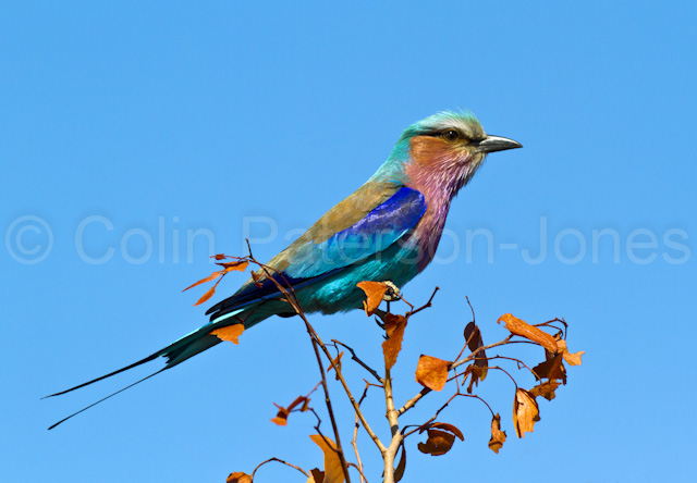 A Lilac-breasted Roller, Coracias caudatus, perched on a Mopane, Colophospermum mopane, branch with dead leaves, Kruger National Park, Limpopo, South Africa