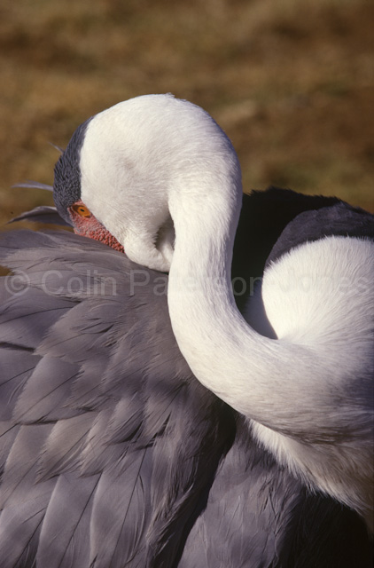 A Wattled Crane, Grus carunculatus, preening at the Crane Sanctuary at Hlatikulu in the KwaZulu-Natal Drakensberg, South Africa
