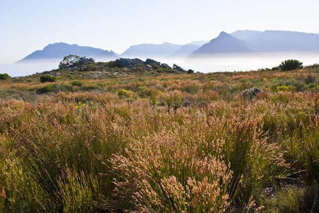 A stand of the restio, Elegia stipularis, flowering in winter with some Euryops abrotanifolius and Leucadendron salignum in flower in fynbos on Slangkop with the Hout Bay mountains beyond, Cape Peninsula, South Africa