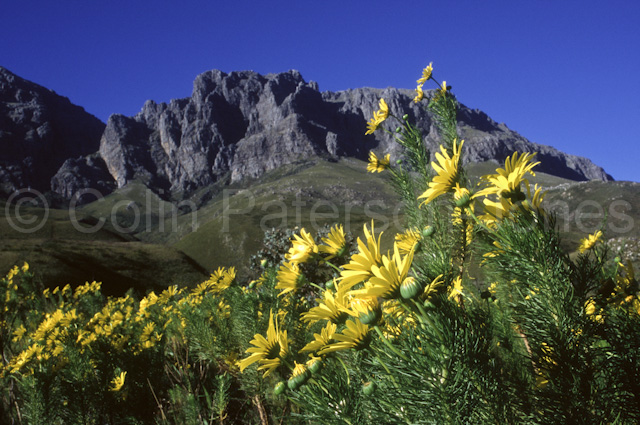Euryops abrotanifolius flowering in winter in the Jonkershoek valley with the Cape fold mountains beyond, Western Cape, South Africa