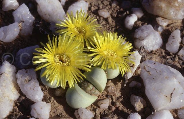 Namaqualand's Succulent Karoo FloraSome 300 km north of Cape Town, the Olifants River reaches the sea. Stretching from here up South Africa's west coast and hinterland to the Orange River (the border with Namibia) and just beyond, lies a near desert. This is the centre of the second of southern Africa's unique floras. The plants which have evolved to survive the harsh environment of Namaqualand and southern Namibia are unique, quite unlike the plants of any of the world's other deserts. Namaqualand is best known for its spectacular displays of massed spring annuals which delight visitors to the region and locals alike. But there is much more to this extraordinary vegetation; this is where a huge number of succulent leafed or succulent stemmed plants have evolved, including miniatures like the stone plants which are treasured by enthusiasts all over the world.