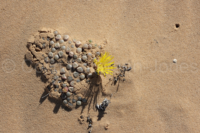 Fenestraria rhopalophylla ssp. aurantiaca in flower in winter in windblown sands on the rocky hills overlooking the Gariep River near Brand Karos in the Richtersveld, Northern Cape, South Africa