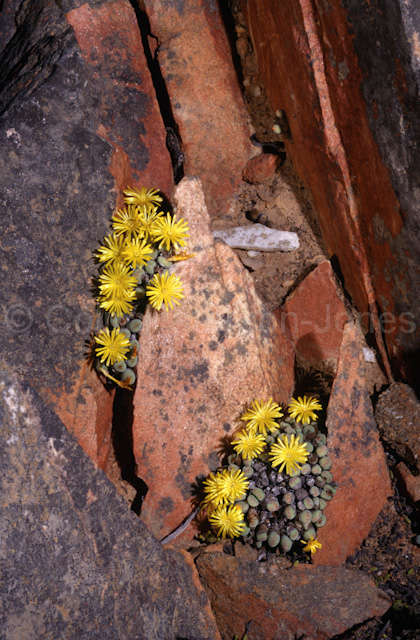 The rare Conophytum meyeri flowering in autumn on quartzite rock on the Oograbies Hills in Namaqualand, Northern Cape, South Africa |